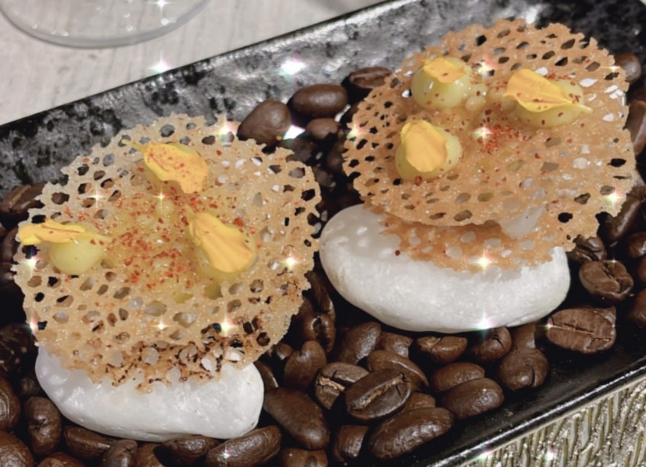 甜點部分也令人印象深刻,把義大利景經典甜點提拉米蘇解構再組合,咖啡磅蛋糕濕潤不甜膩,上方擠花為馬斯卡彭混合沙巴庸,帶出輕盈感,咖啡酒香氣隱藏其間。微微可惜是,自己餐後飲品是點選美式咖啡,先喝了咖啡後再品嚐甜點時,蛋糕咖啡香氣被飲品的咖啡遮蓋較不明顯,但家人搭配紅茶與國寶茶時甜點咖啡香氣十分相得益彰。蠻意外能吃到使用沙巴庸為構成元素的甜點~為當日用餐劃下完美句點。