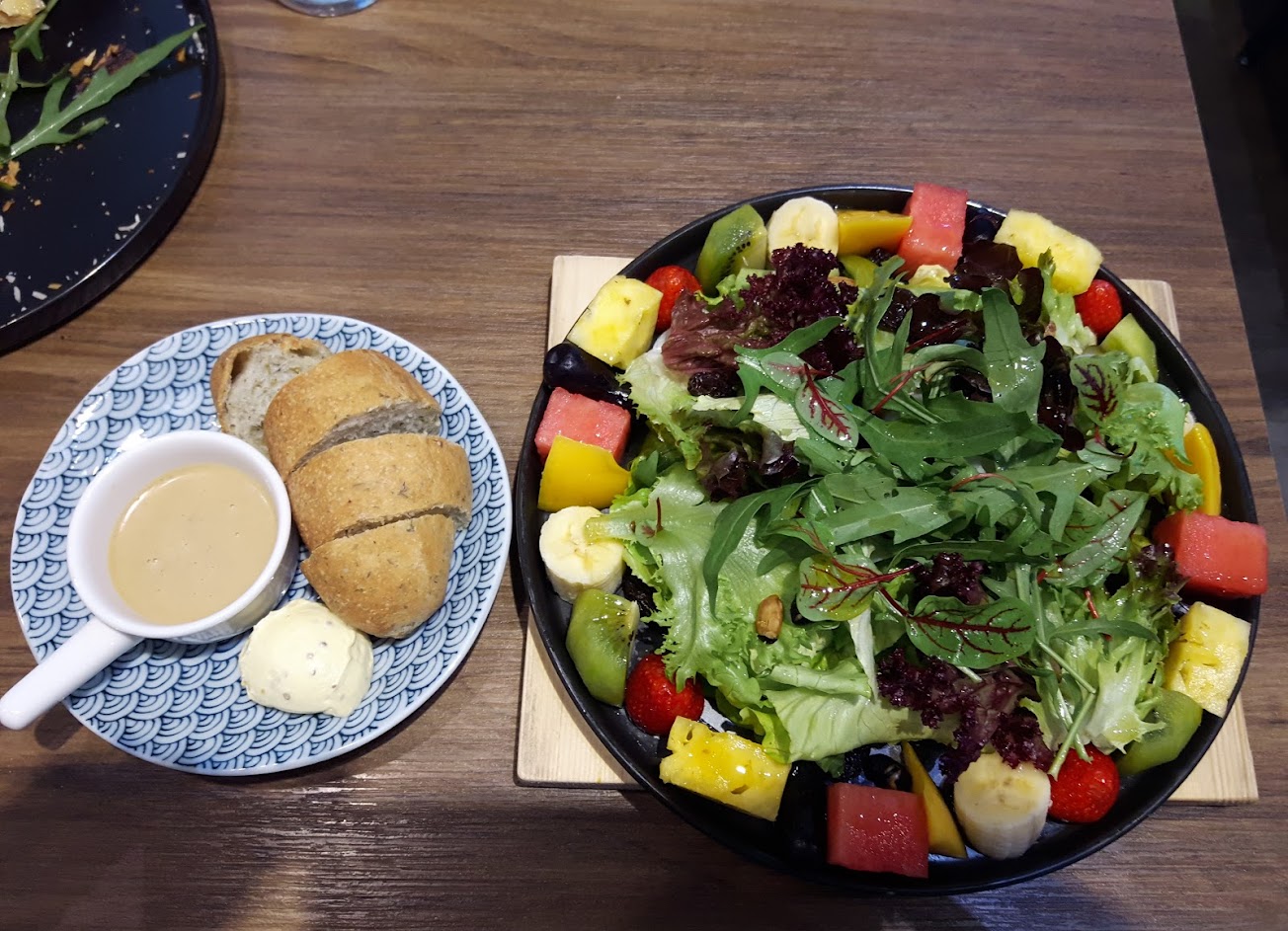 他們家的沙拉系列都很澎派,份量也很足,會附上佛卡夏麵包跟甜點,大量生菜葉搭配多種季節水果,色彩繽紛很美味的感覺