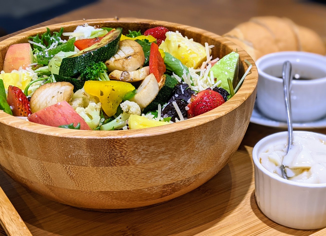 溫沙拉: 裡面超豐富啊!(香蕉、鳳梨、綠葡萄、白綠花椰菜、杏鮑菇、黑豆、櫛瓜、堅果 、紅綠黃甜椒、、木瓜、蔓越莓、葡萄乾、南瓜子、大量生菜) 櫛瓜、花椰菜有先煎過、香氣十足加上油醋醬有種在吃一道料理,不像外面一般的生菜沙拉像冷盤的感覺! 溫沙拉讓我們的味蕾被瞬間打開、食物在嘴裡打起交響樂!這就是我「理想中的沙拉啊!」油醋是不嗆的那種,很溫順,必須點看看絕對不會讓你失望!營養滿分!