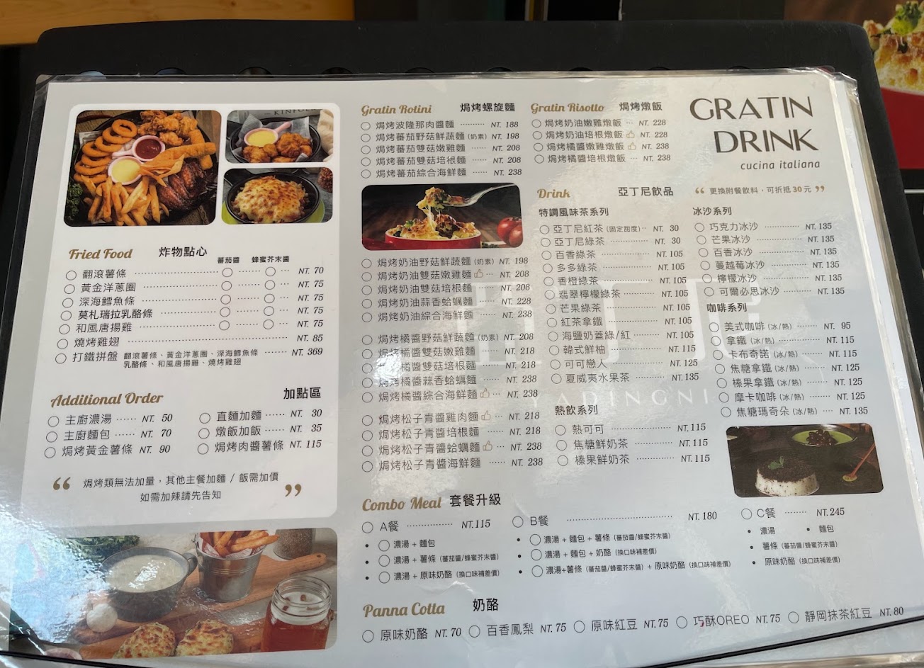 在網上找餐廳時看到這家 位置在警局旁巷子裡 很酷 不過車位不好找 店裡座位下面有提供小籃子放東西 很貼心 餐點非常好吃 焗烤跟燉飯很合 薯條跟麵包真的CP值很高 薯條超級脆 很香 麵包除了有焗烤之外裡面是九層塔也很驚喜 另外裡面的店員服務態度都很好 問問題的時候的仔細在聽 很熱心的回應 這次幫我們服務的是 梓恩 態度真的很好 也很有禮貌 謝謝~ 整體用餐體驗很讚ˊˇˋ 服務 內用 餐點類型 晚餐 平均每人消費金額 $200-400 餐點:5 服務:5 氣氛:5