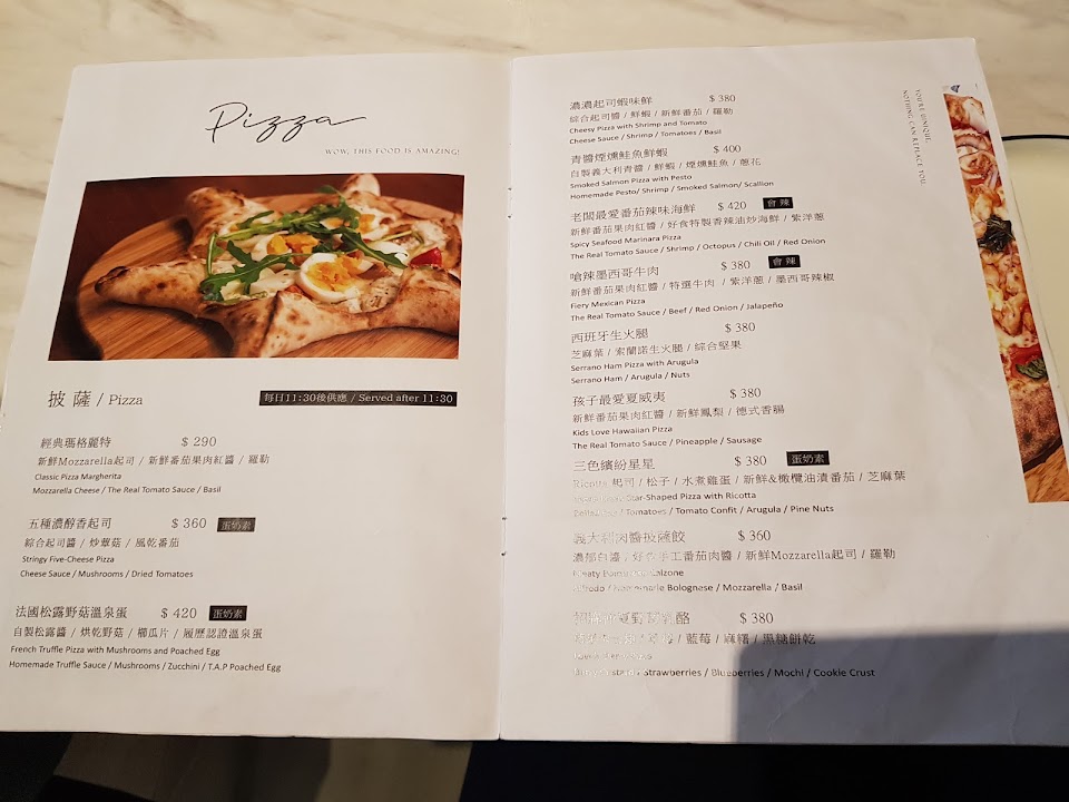 喜歡這種用餐的氛圍,潔淨明亮的場域,清聲細語的用餐客人,我的確享受了美好的午間時光!唯一可惜的是我所點的plzza餅基有點太軟,不足以撐起單手抓食的硬脆度,剛開始食用時,不小心滴了一點起士到衣服上!這不是餐廳的問題