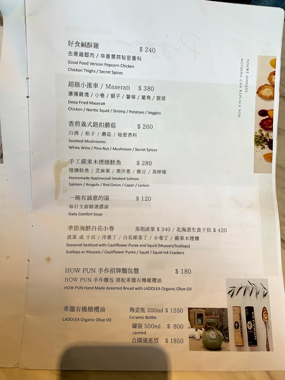 主食餐點好吃,戰斧豬排美味,牛排很嫩但份量較少,松露腿排很特別,咬下去也蠻多汁的,麻油雞燉飯很香,雞腿煎的酥酥的。菇茹脆餅也很酥脆好吃。南瓜濃湯比較家常,和一般的法式餐廳的南瓜濃湯味道略有不同。服務人員服務態度很好。唯座位稍嫌擁擠,和隔壁桌靠得比較近。此為美中不足之處。