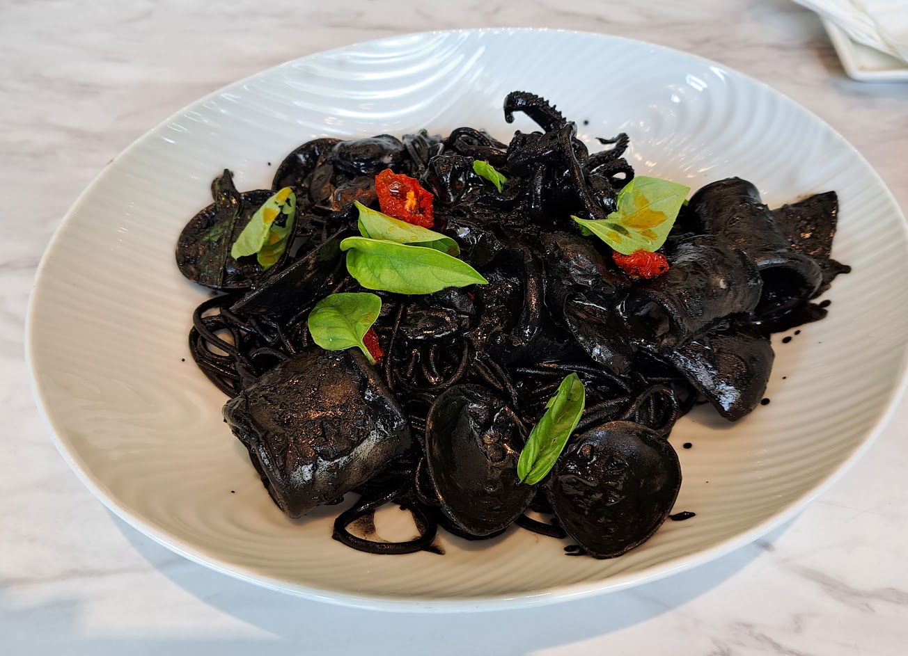墨魚義大利麵的鮮味搭配微辣的調味 更能襯托海味的鮮甜 也不會太搶墨魚的味道,非常滿意!