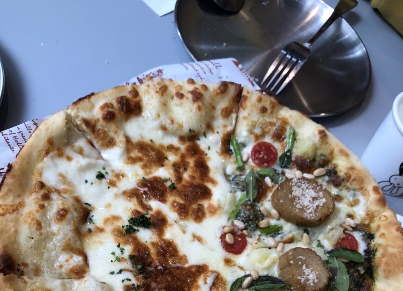 披薩能夠選兩種口味很貼心,滿足選擇困難症的人,餅皮也是店家自己做的。青醬pizza 上的食材很豐富有松子、馬鈴薯、蘆筍、芝麻葉。