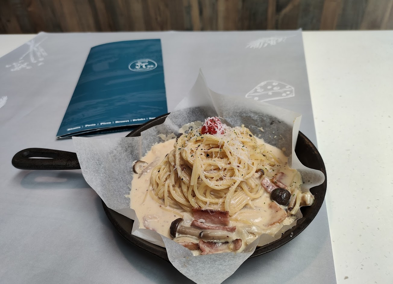 用平底鍋裝著白醬義大利麵,參雜些許培根與蕈菇,在麵體上適中偏軟一些,味道上培根的煙燻味混和淡淡的奶油香沾附著麵條吸入口中,但是起司的風味未能在口腔中散發,整體不錯。