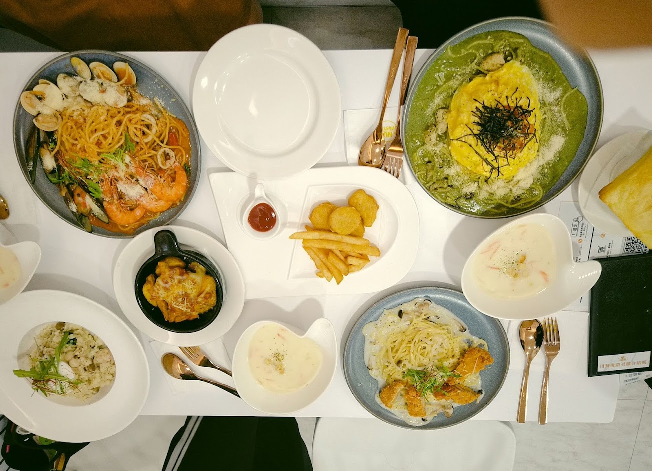今天第一次去吃,點了主餐奶香匈牙利舒肥嫩雞義大利麵,蒜香蘆筍椒麻雞焗飯,很好吃很美,但義大利麵旁邊擺盤的薯角有點涼掉,這點有點可惜,酥皮濃湯的酥皮現烤很香脆好吃,湯就一般般,白桃冰茶微糖好喝,但有點偏甜,檸檬塔味道還不錯,但塔皮偏厚,個人喜歡薄塔皮。整體環境舒適,白色俐落乾淨風格,餐具也美美的,有用心,服務員態度很好,輕音樂也讓人很放鬆,是可以再去的餐廳。