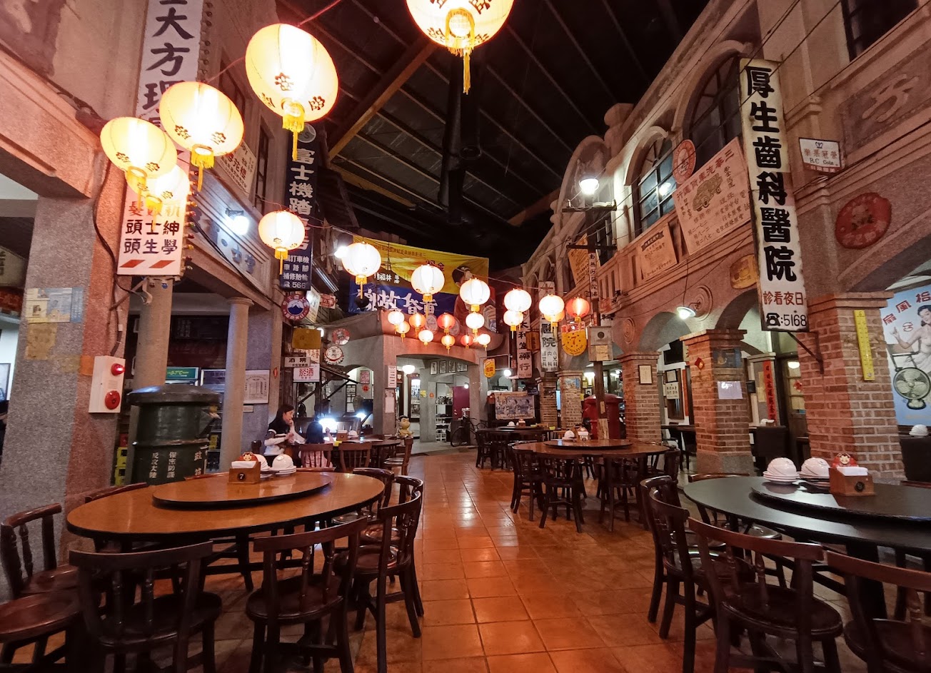 從門外到室內都洋溢著濃濃的節慶歡樂氛圍,懸掛的燈籠和復古的招牌以及通俗藝術品讓眼球應接不暇,感覺穿越回到民國初,是台中在地人充滿回憶的重要據點,二樓是包間,走廊也是裝潢成影院包廂的風格,餐廳已經開幕30多年,2年前因為疫情歇業,後來換老闆重新開張,繼續承載台中人共同的記憶~