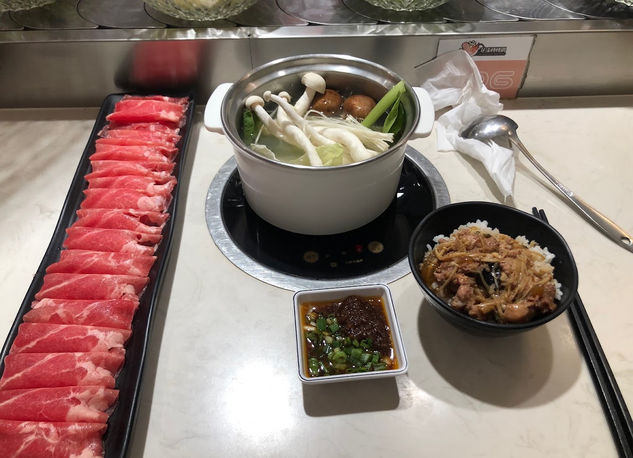 旋轉菜盤很有趣 副餐很特別是瓜仔肉飯 …可惜火鍋料選項偏少 $259有附烤布蕾? …