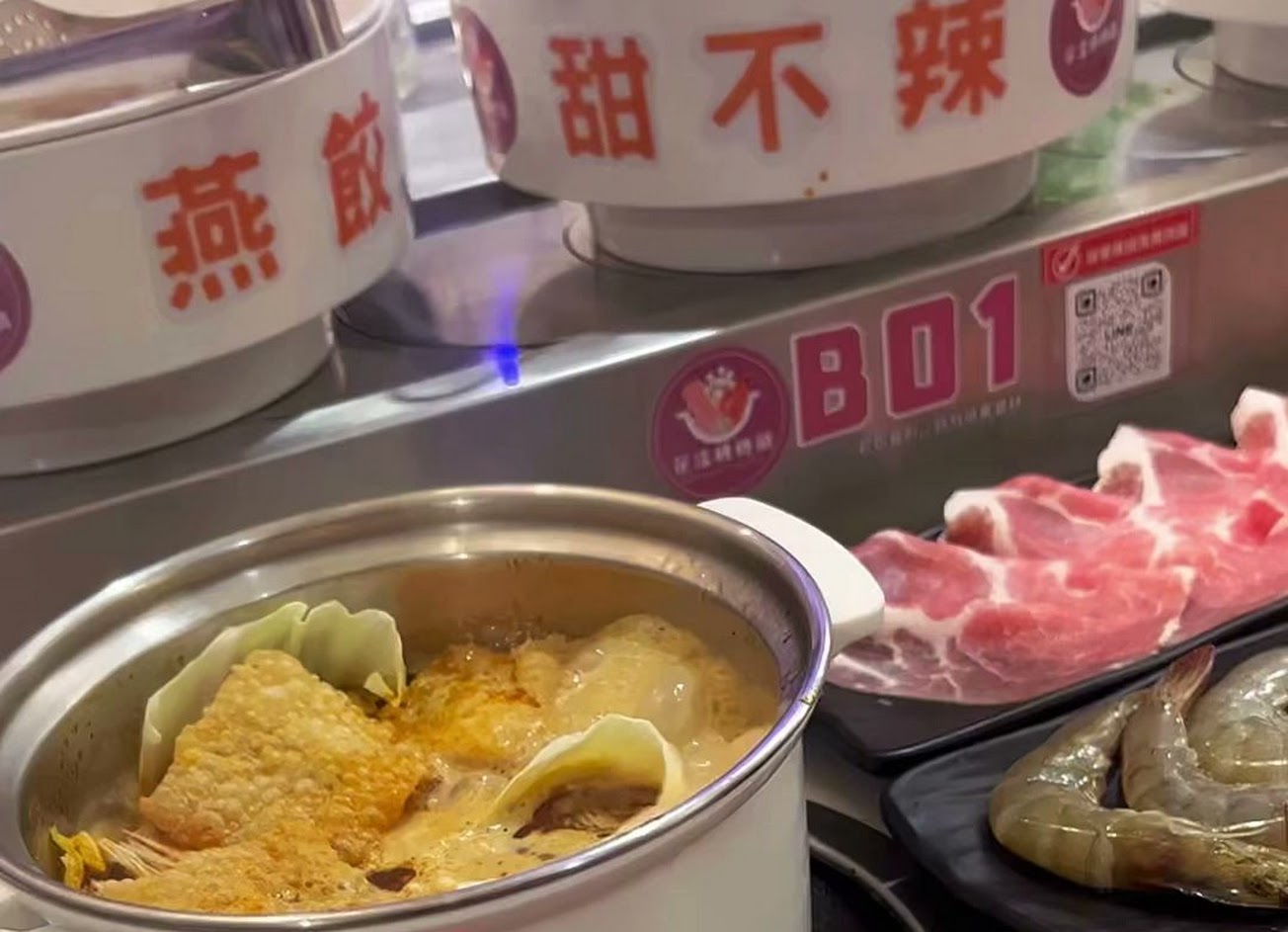 迴轉台上新鮮蔬菜、火鍋料、各式鮮菇, 主食鍋燒麵、蒸煮麵等,無限吃到飽~ 自助吧 則提供無限量白飯? ?️搭配瓜仔肉、麻辣鴨血、沙茶牛肉! 另外飲料吧也有4⃣️款,還有冰淇淋? 飯後還附焦糖烤布蕾哦!超豐盛!