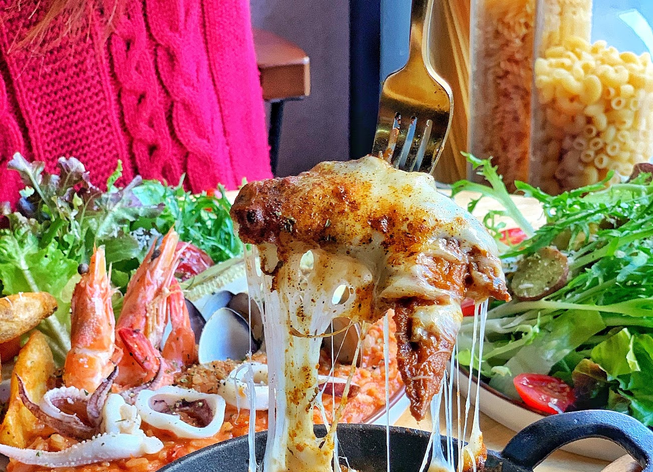 這個我超喜歡的吔?,竟然不是大家熟悉的燉飯,而是很少人做的炊飯,比較不濃稠,米飯軟硬度較適中,與番茄醬酸甜滋味結合搭配的恰到好處,上面放上小卷/鮮蝦/蛤蠣,一旁搭配時蔬,超有飽足感?