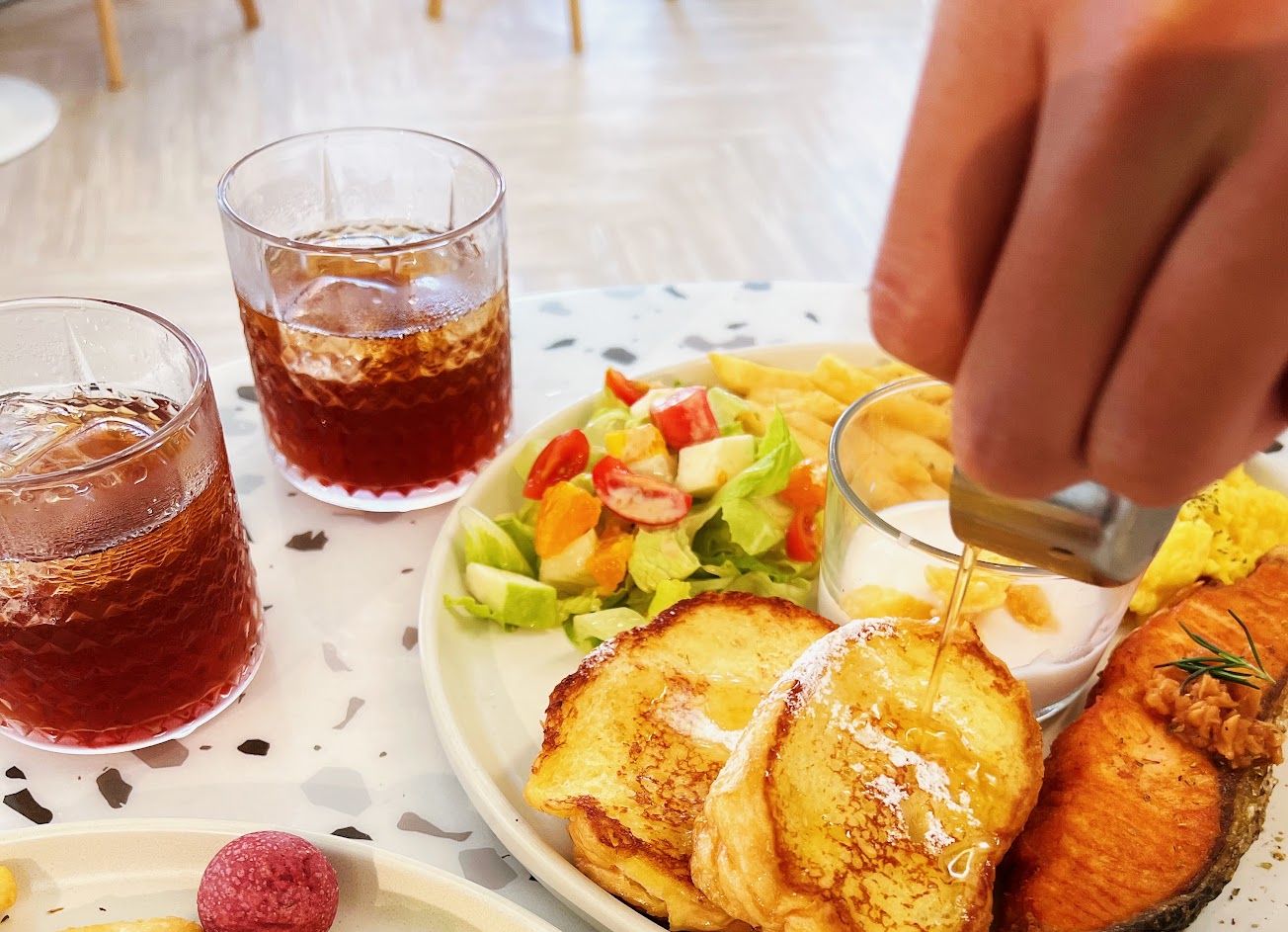 好拍好食,清新簡潔用餐空間,早餐豐盛搭配蔬食+可愛的紫色地瓜球很好看,飲料可續杯?,假日建議要訂位,可能要稍等等