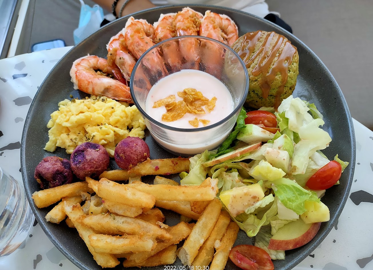 今日點的是蒜香奶油蝦餐盤,薯條炸的剛剛好,法國吐司很鬆軟,優格是偏甜的口味,主題的蒜香蝦子有剝殼,味道適中,不會太淡或太鹹,菜單選擇多樣!
