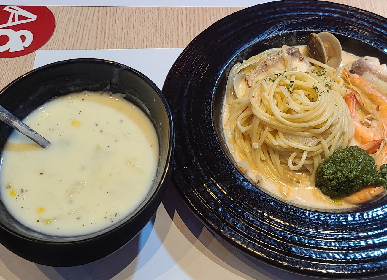 好吃,但為什麼同樣是招牌奶油蒜辣義麵,兩碗會長得不一樣,沒有特別的喝湯汁