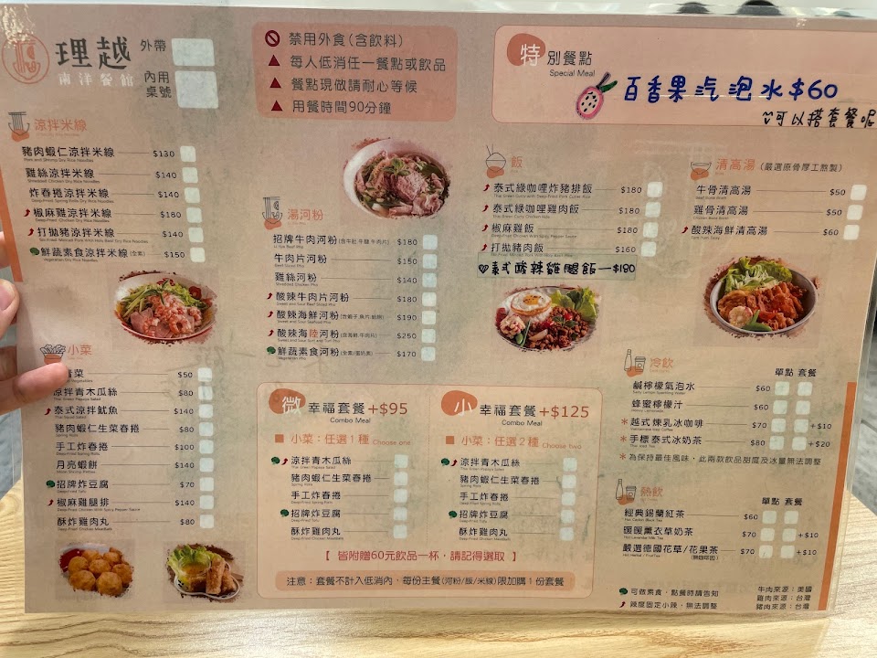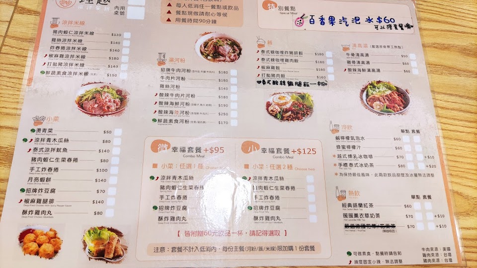 涼拌米線超好吃,炸春捲有滿滿芋頭,吃了超有飽足感 涼拌木瓜絲光小份,份量就很充足,不過是我第一次吃偏辣的口味有點不習慣 椒麻雞腿排有軟骨超讚,吃了會很想配白飯 牛肉河粉的湯超讚!喜歡酸的朋友檸檬可以不客氣的擠,又香又辣又清爽 服務 內用 餐點類型 晚餐 平均每人消費金額 $200-400 餐點:5 服務:5 氣氛:5 建議的餐點 炸春捲涼拌米線
