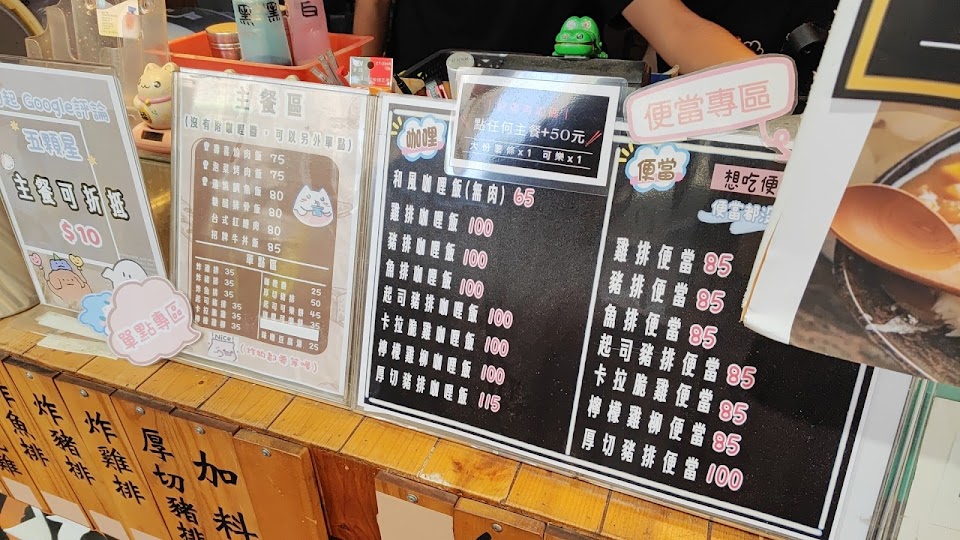 112年12月8日用餐,真的不禁讓我好奇這家到底是怎麼存活下來的。我和我女友都同意店家室內有股潮濕,像溝渠的蟑螂的味道,起司豬排咖哩100跟雞柳便當85,店家有優惠五星評價就能享主餐折10元,一送上來,我們兩位都傻眼,豬排超小,大概直徑只有4.5公分,里肌肉超薄夾著一片火腿跟起司;雞柳也只有兩條,即便折價下來90跟75,我們還是一致認為太貴,真的是一次店,這個配置70、80真的是上限了。