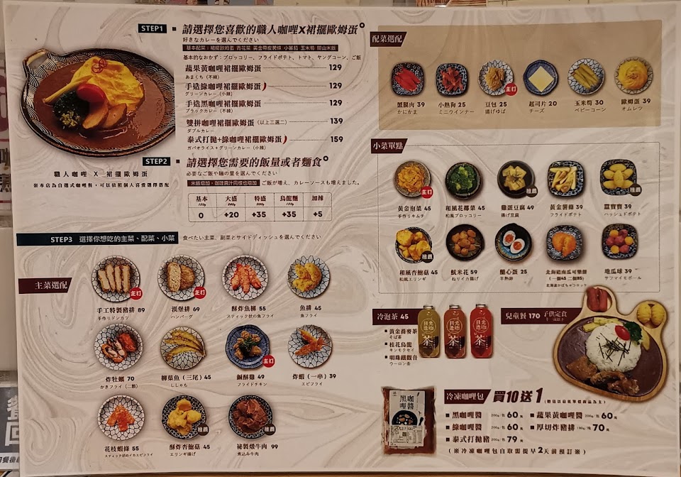 位於逢甲附近河南路上的這間咖哩店,顯眼的天空藍當背景,打著79元咖哩招牌吸引著我,主要醬汁就是1.黑咖哩 2.白咖哩3. 綜合,我點的是綜合口味,結論是我個人偏白咖哩,首先2者醬汁的濃稠度都調的不錯,但他們的黑咖哩卻沒有「佛×特」好吃,但白咖哩裡面帶點椰奶香氣,在搭配適度的辣味,敲好吃到,當然食材也可以自己搭配,看你想要炸豬排、魚排、青花葉、玉米筍……都可以,但雞蛋豆腐有一點小走鐘,因為豆腐切的太大塊,沒辦法一口塞,此外外面的麵皮也沒辦法炸的金黃酥脆,但份量是蠻有誠意的!