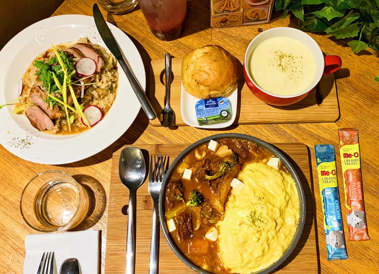用餐體驗不錯,店裡有兩隻貓,是寵物友善餐廳(貓會跳到桌上,很親人可愛