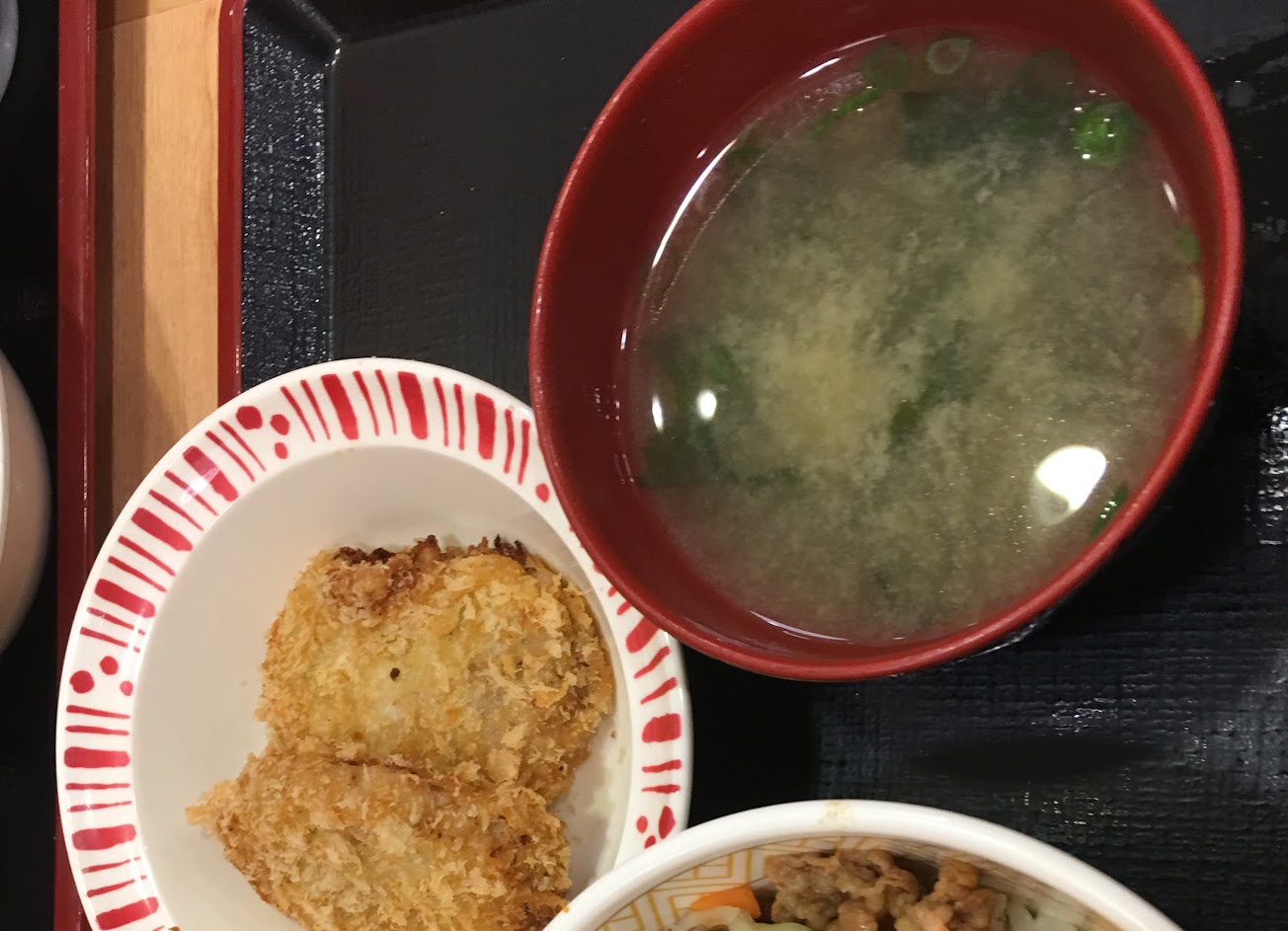 這次我另外選了可樂餅套餐,還有海帶味增湯,這湯我也愛,因為我很挑味增湯的,至於可樂餅沒有我想的那樣美味,而附上的麥茶(應該是麥茶)無糖,冰涼好喝。