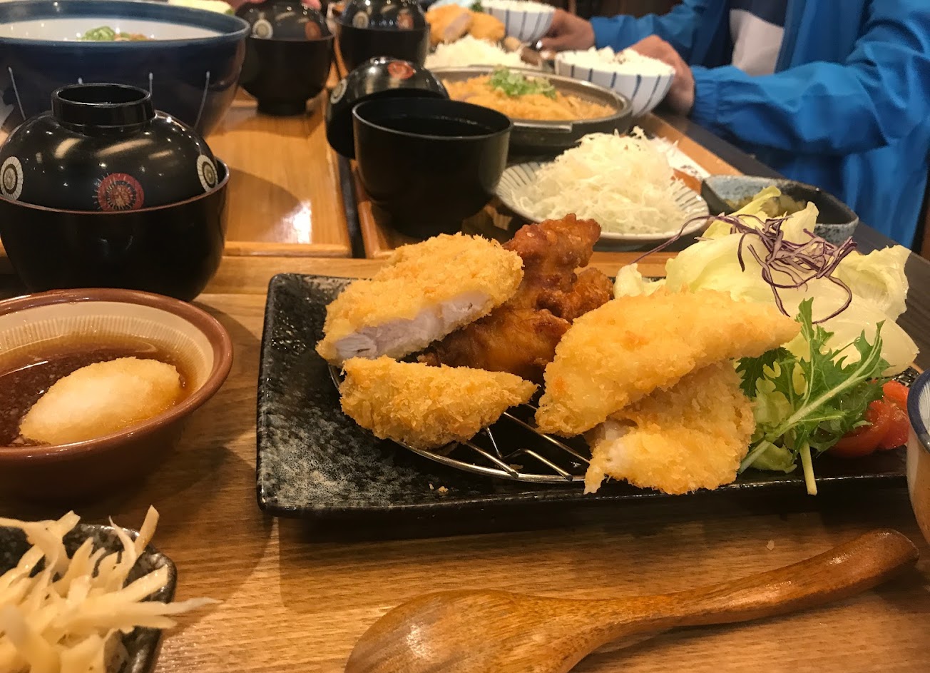 綜合炸物定食(豬排、雞塊、白身魚)肉很嫩也多汁,香菇天婦羅的表現也是很棒,香菇軟嫩多汁、金針菇還有酥脆跟軟嫩口感!小菜跟高麗菜絲味增湯都可以無限續,人員的服務也很親切喔!甜點的芝麻奶酪跟千層蛋糕更是出乎意料的好吃!是表現非常好絕對會再訪的店家。連音樂都是徹底的日文歌,氣氛棒!
