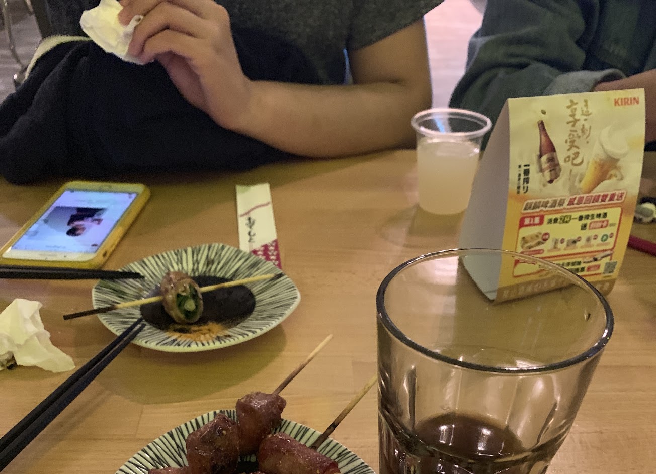 串燒不算貴,但是燒烤醬味道好濃又好膩,感覺每一種串燒都是同個味道,把每個食材本身味道都蓋掉了,味噌湯沒有熬過的湯頭的感覺,蛋花湯也算滿普通的。不能帶外食,門口非常多人在抽煙。