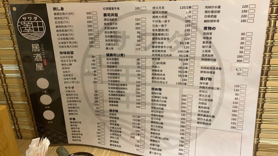 平日晚上來用餐但幾乎客滿,店內座位數不多(目測大約可容納2-30人),建議提前打電話詢問與訂位。 整體環境乾淨整潔,冷氣夠強到搭配電風扇有點太冷,怕熱的人應該很愛? 這次點熱炒類居多,炒飯可以推,炒烏龍麵也不錯,剝皮辣椒雞湯薑味頗重,但可以續湯且是卡式爐加熱型,一份350來說愛喝湯的人強烈推薦!胡麻松阪豬還行比較乾柴,魷魚喜歡搭配檸檬汁與胡椒鹽很好吃。串燒類有點蔥燒豬肉,汁多很讚給推,牛肉跟雞肉一般不會踩雷,明太子口味的蠻特殊可以點來嚐嚐,花捲壽司無功無過。 (補充一點,他的熱茶真的好好喝,很順口,店家如果看到這個評論的話,可以回覆一下用的是什麼茶嗎,感謝~~) 整體來說,是一家預期之上的居酒屋店,適合兩三人也適合七八人一桌的聚餐好所在,服務無話可說非常親切,價格介於平價熱炒跟對更高階居酒屋之間,以此次用餐6位人均近四百能吃八分飽來說,CP 值不可謂不高,是如果有人詢問推薦的居酒屋會想到的店家。 服務 內用 餐點類型 晚餐 平均每人消費金額 $200-400 停車場 停車位算多但考驗停車技術,停車費價格合理(沒記錯的話一小時40),且雖然數量多但非特約,有沒有車位還是要看當天狀況