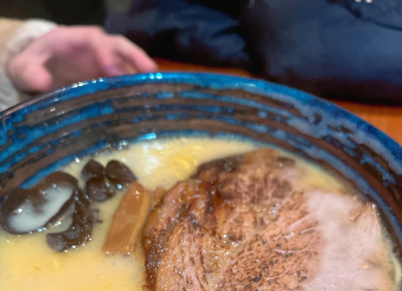 喝了第一口湯,嗯!它的豚骨湯頭非常非常的濃郁,但又不會太油,非常的順口,再來是豚骨切片非常大塊,肉吃起來一點也不柴,帶有一些油脂,看起來部位是挑過的,整體搭配非常適中 。