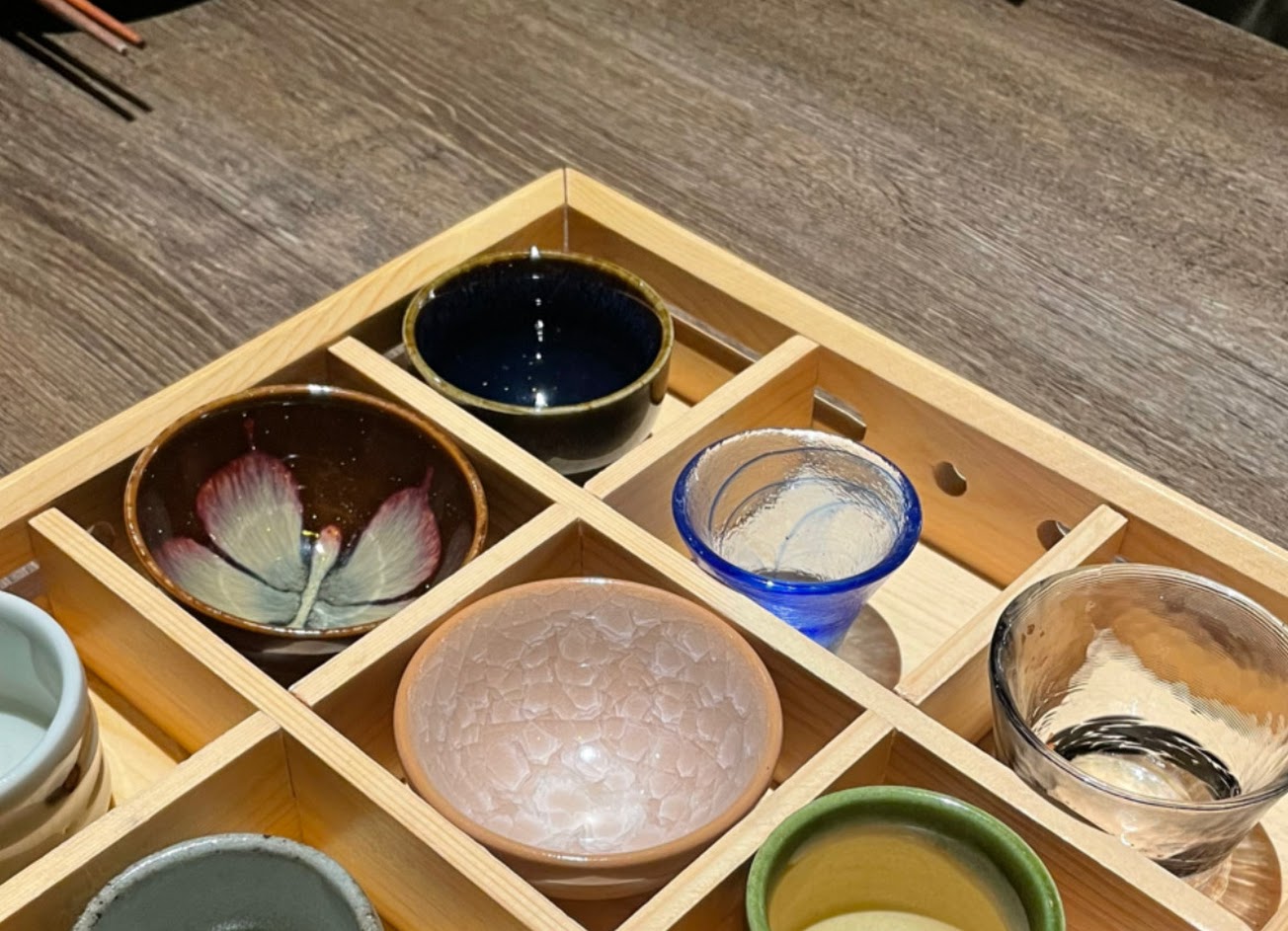 清酒款式多, 最特別的地方是上了一盤杯子能做選擇! 番茄必點!