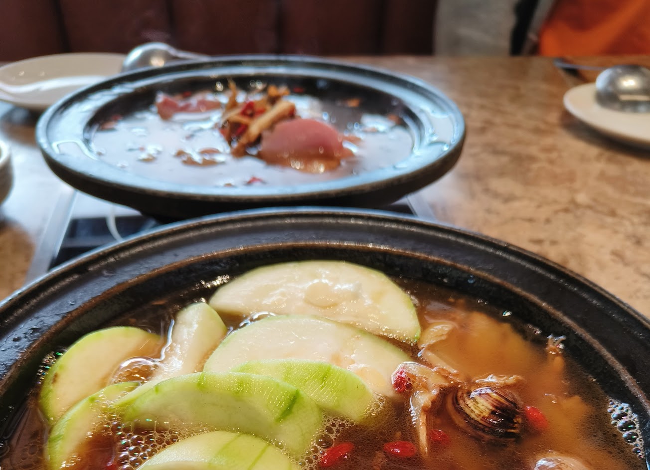 餐點:大推新品蛤蠣絲瓜湯底,絲瓜給的很多湯頭清爽,燒酒雞湯底的中藥我覺得要包起來,不然都浮在湯上面很容易去吃到。