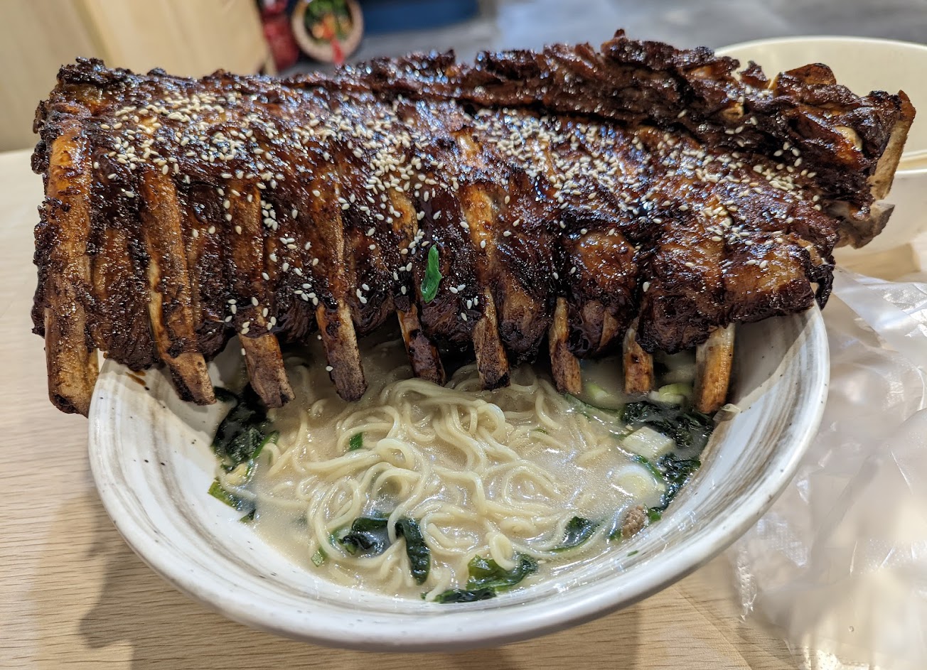 看評論衝著豬肋排來踩點的 當了當日第一組客人 結果進去後點餐時被告知今天的豬肋排都被預定了 需前日預定才能吃到 上菜速度緩慢 麵裡的炙燒豚腹肉跟麵極度不搭味道重零散的肉口感也不佳 麵裡的蛋遇到上漲或缺貨 改成了竹輪 也是麵上了才告知 麵口感很軟 沒有在菜單上或點餐時詢問是否可以調整軟硬 用餐完畢有來詢問口味是否習慣這點還不錯 不過是真的不習慣…