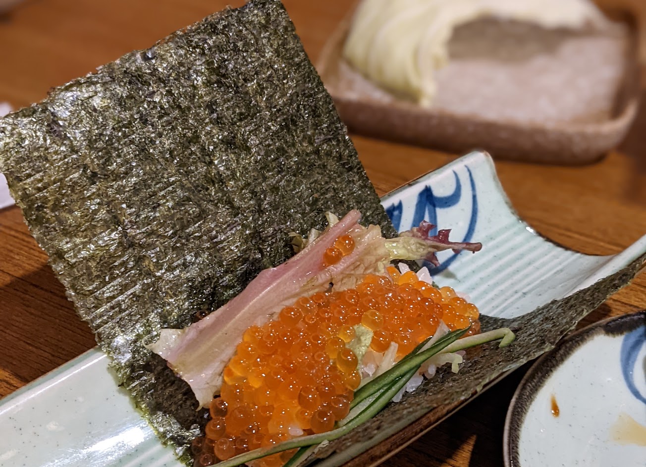 雞肉烤的不錯,豬肉太柴;鮭魚炒飯可以,炒烏龍麵糊成一團,烤飯團太硬;生牛肉還可以,烤茄子用起司,沒有很對味;火鍋只有第一鍋湯底還可以,加湯後淡而無味,惨不忍睹;朋友的生蠔看起來ok,不過我沒吃;整體而言,CP值算普通;單點比較好,不建議固定金額讓店家配菜。
