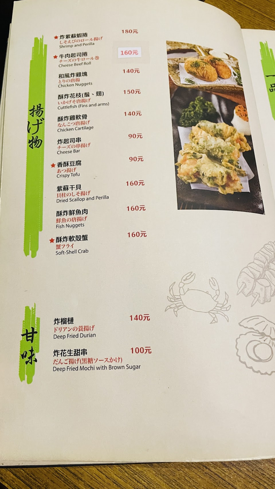 炸物為紫蘇炸蝦卷及炸豆腐,蝦卷紫蘇葉包裹滿滿的蝦肉,口感極佳。