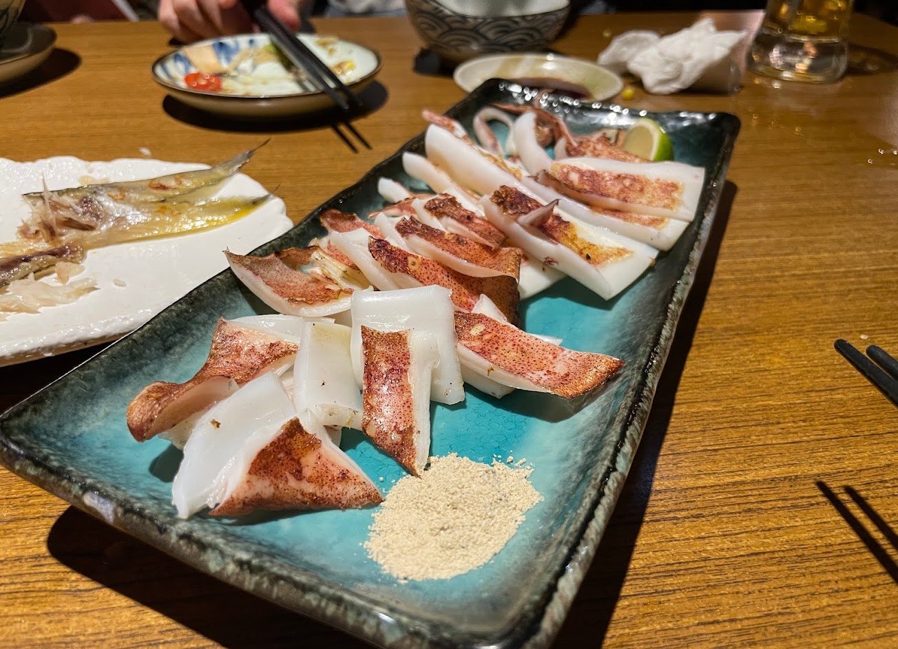 雖然口味偏重、但食物好吃。 蝦捲的口感很脆、一整隻蝦在裡面,很推的一道菜。 鮭魚烤飯糰烤的很剛好,飯有一點黏性吃起來卻又酥酥脆脆,也是很棒的一道食物。