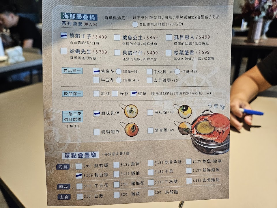 之前都是去一中店吃,這次去河南路的逢甲店,發現菜單又更新了!101海鮮塔變貴很多,個人鍋少了一層,以前在一中店吃個人鍋,海鮮有很多種選擇,現在物價飛漲,很多都要單購,茶飲變大杯了!其中有位服務生從頭到尾都擺臭臉,原本開心期待去逢甲店用餐的心情都被破壞了!???️