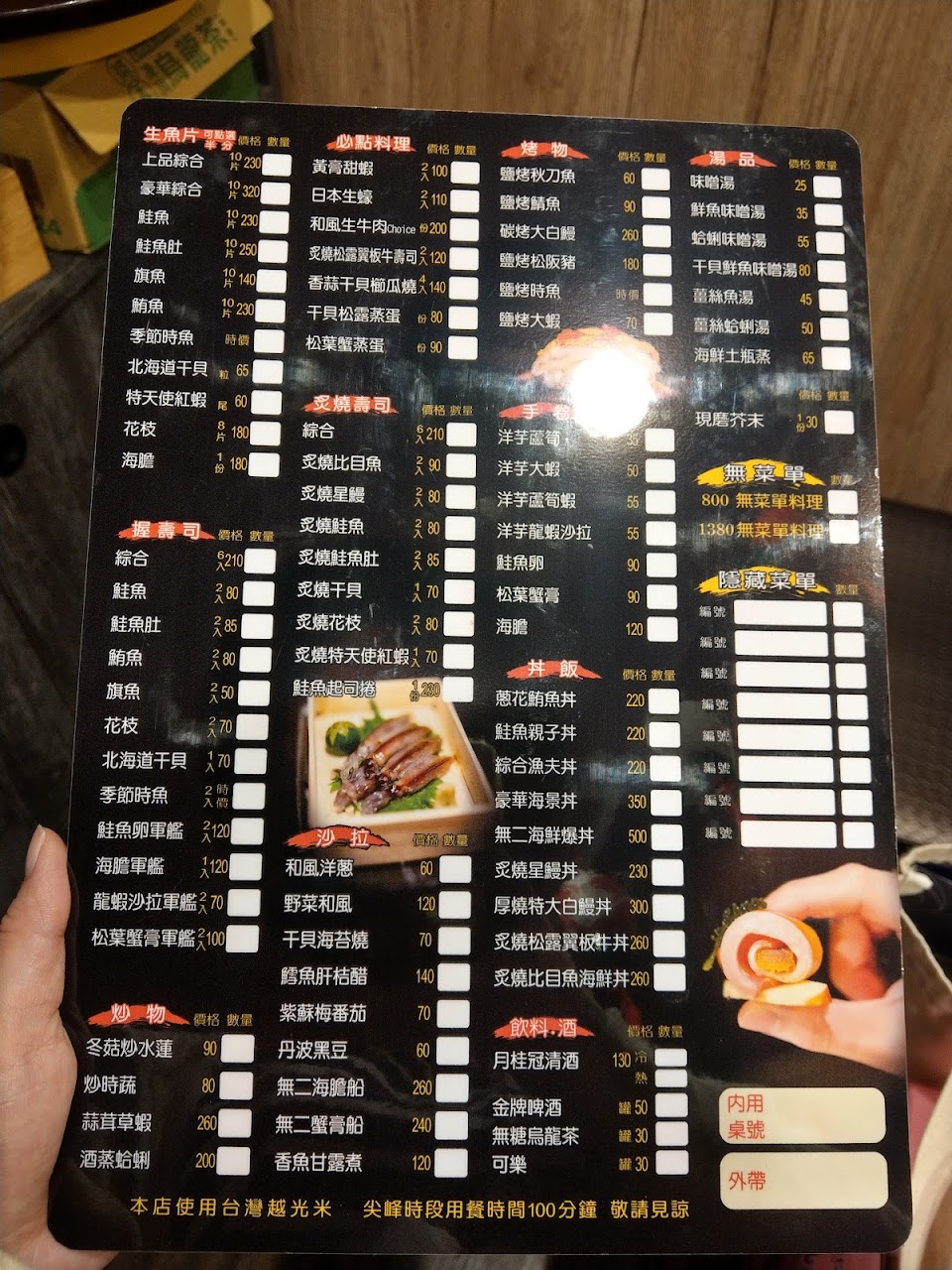 綜合生魚片, 鹽烤鯖魚, 鰻魚飯, 干貝松露蒸蛋, 鮭魚起司捲, 蛤蜊湯, 烤蝦, 日本生蠔, 炙燒松露翼板牛丼, 香蒜干貝櫛瓜燒, 烤大蝦, 烤秋刀魚, 手捲, 鮭魚親子丼