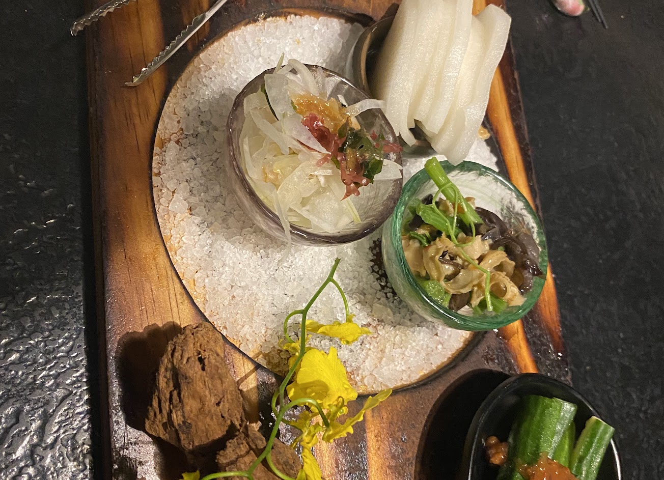 店家正隔壁就是付費停車場,但不是特約停車場,需自行付費 是王品集團騎下的品牌,裝潢風格很日式有質感,但空調抽風可再加強,因為一走進去就可以聞到油煙味,原因是因為其中一道菜是要自己烤牛肉片,所以會有油煙 點了極上套餐980元+1成服務費 人員的服務還蠻親切的 套餐的菜色非常豐富、容器也很講究、擺盤也很有特色 覺得每一道菜都很好吃 黃金活蜆土瓶蒸,好喝且可以一直免費續湯 深海魚皮野蔬沙拉佐醋醬,新鮮好吃,上面會撒一些蒜片酥,不敢吃蒜頭的我真心覺得蒜片酥好吃 季節海鮮時蔬捲,新鮮但口味普通 產地直送刺身之盛宴,這道我沒吃我不敢吃生的,但朋友說很新鮮 鹽烤午仔魚一夜干,烤的真的好吃沒話說又新鮮,一定要跟服務人員要胡椒鹽,沾著吃超好吃 現炊蕈菇斧飯,不是一般的白米,米飯的口感不錯,拌勻蕈菇後整體吃起來很香、好吃(不愛米飯的我都覺得好吃) 極黑和牛盛和,肉片約莫2mm,烤和牛肉片的時候會比較忙一點,建議一次烤完全部,不然很快就沒爐火了,服務人員會跟你介紹怎麼烤,介紹完就得自己來了,先夾牛油在烤盤面抹上一層牛油避免等會煎和牛片時黏住烤盤,但坦白說後面接著烤其他片時還是會有點黏住,不過真的新鮮好吃又嫩,但烤的時候油脂會彈到桌面都是油⋯ 愛美又怕衣服會彈到的人,建議圍個餐巾會比較保險 收走和牛擺盤時,服務人員會用濕抹布擦乾淨桌面,但建議濕擦後可以貼心的用乾的紙巾再擦一遍會讓人覺得服務品質更加分 日式布丁佐時令鮮果,這道我只吃到水果,水果是紅地球葡萄,很大顆又新鮮 手作白玉甜品盛和,這道是三個甜品為一個組合的甜點,小麻糬好吃不會太甜、抹茶仙草凍甜度也剛好、抹茶脆皮夾紅豆泥,甜度也剛好(好像在吃古早味的脆皮夾冰淇淋) 鮮榨鳳梨苦瓜汁,真的好喝又新鮮