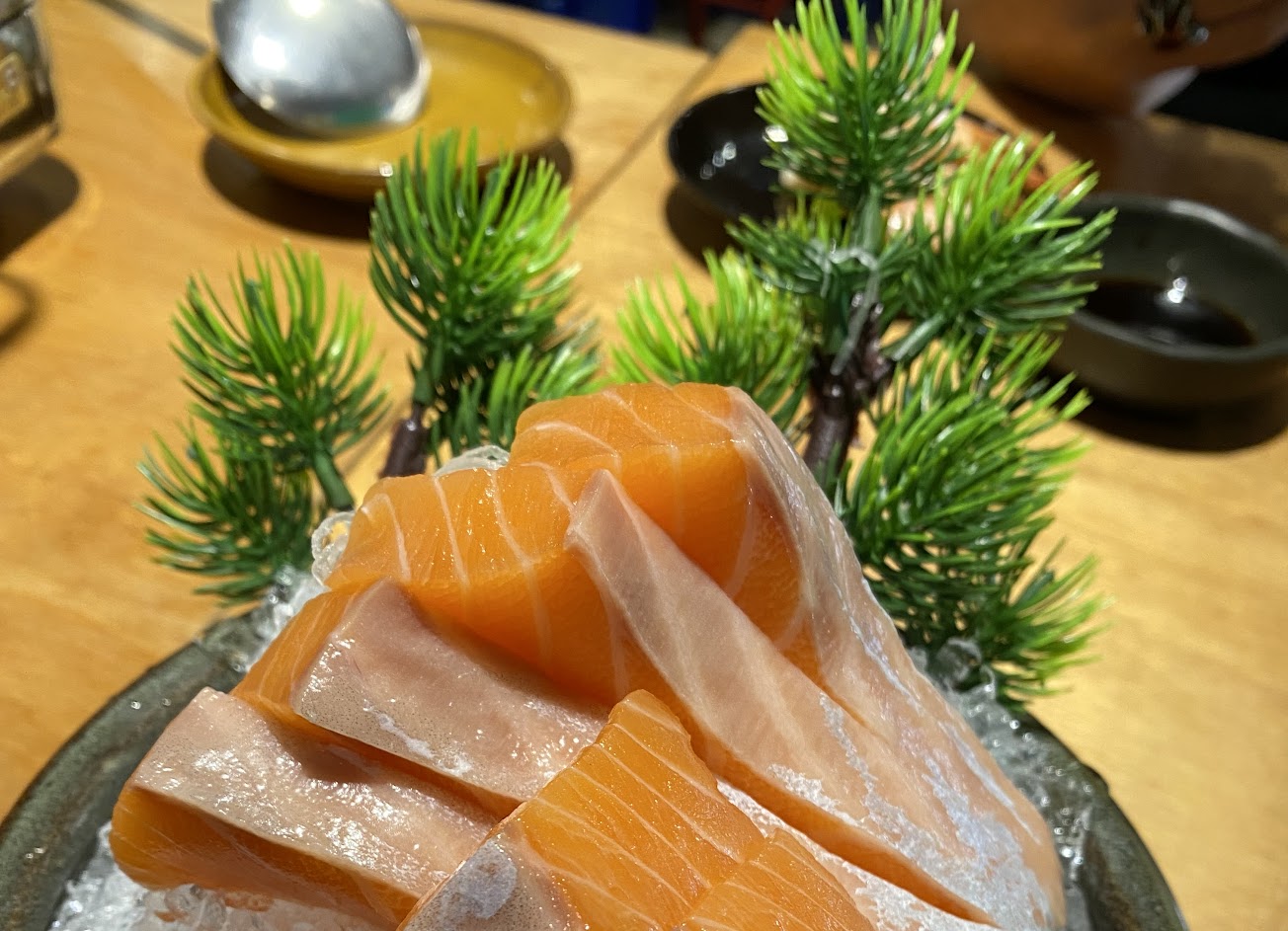 鮭魚生魚片雖然要加價,但真的好吃,必點,洋蔥沙拉太辣,看個人的接受程度了。