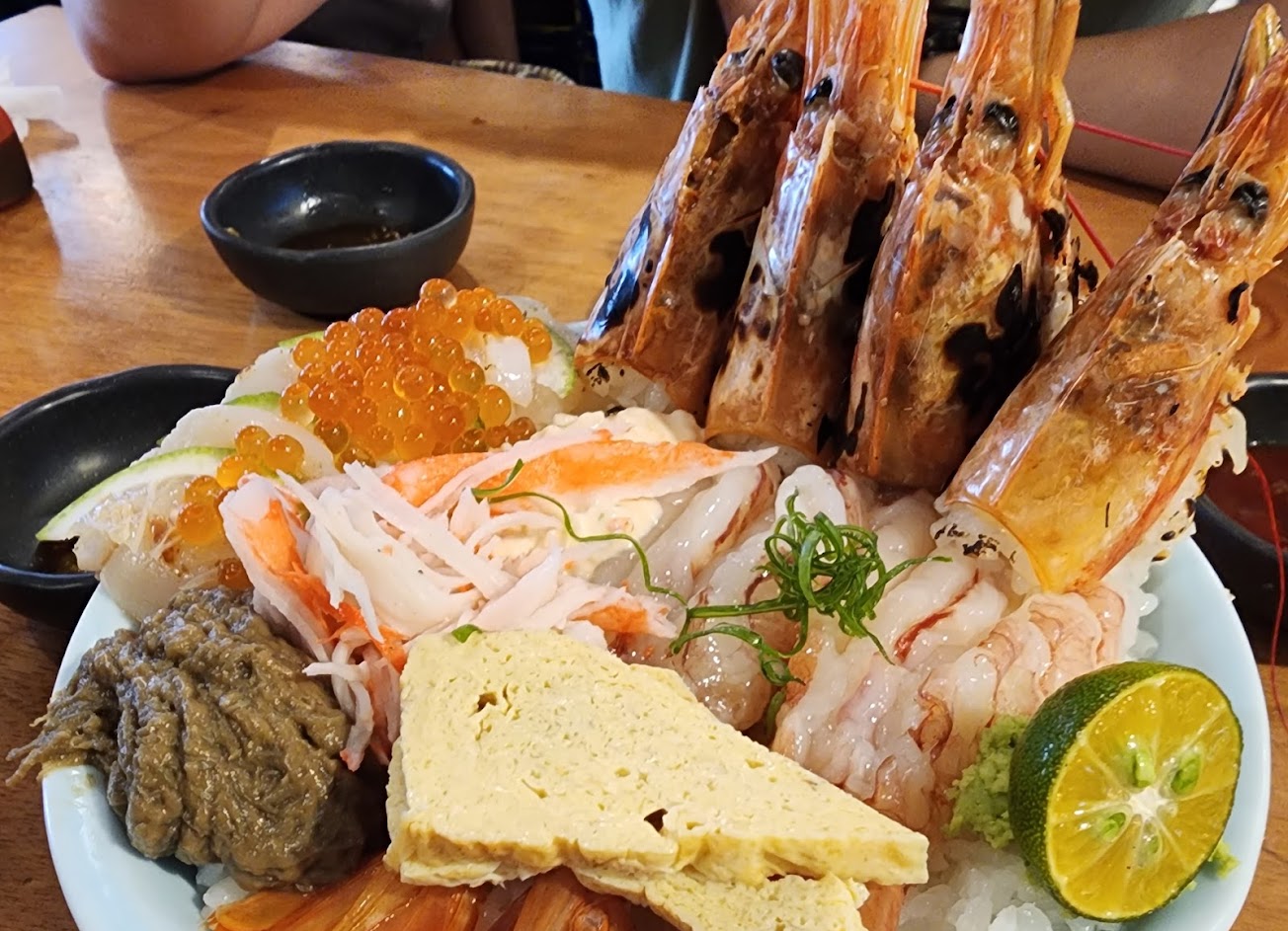 氛圍與裝潢採用許多木作與傳統日本的風格,店面很棒,可是丼飯的大小令人失望,排山倒海丼只能勉強說是小山丼,個人點的是炙燒丼,以我身高接近一八零的人只能說完全不夠,不過料理完成度很高,壽司與炸雞有令人稍微驚艷,確實不錯,建議可以多點丼飯以外的東西,cp比較好,然後裡面放油阿搜比是加分項。