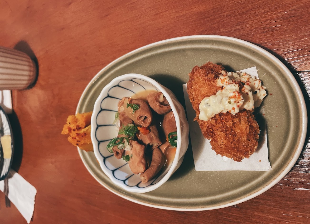 烤山藥肉味增中規中矩 小菜組合三的味玉非常鹹 但牛蒡絲調味適中 炸牡蠣超巨大又不油膩