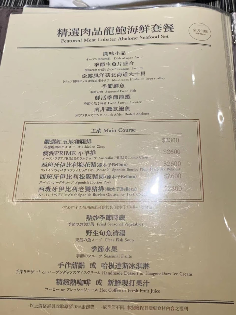 午餐時段晚餐時段,同套餐價格差了快一兩千,整體吃下來也不知道憑什麼高這麼多,感覺晚上用餐很盤