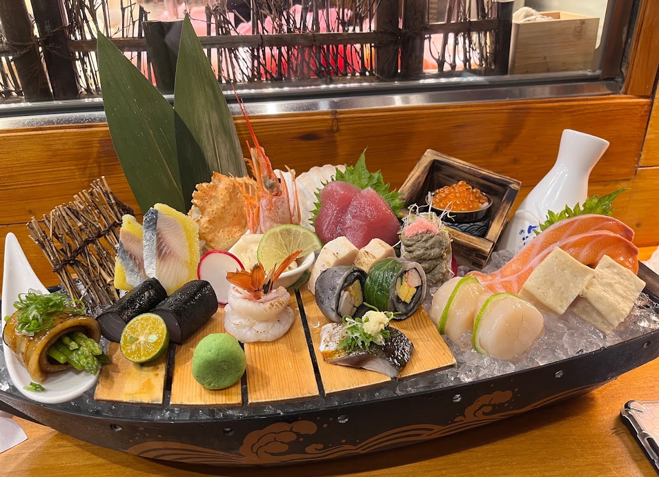 ➋?明治盛合刺身$710:有鮭魚、鮪魚、旗魚、黃金鲱魚、日本干貝、蟹膏、鮭魚卵、牡丹蝦、星鰻、扇貝,原本有海膽但因缺料所以變成其他食材增加一點。總歸一句:大船入港,整體擺設跟用料都很有氣場。