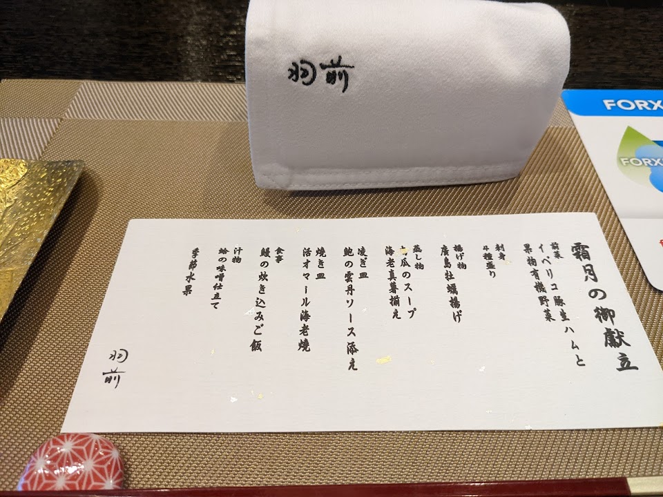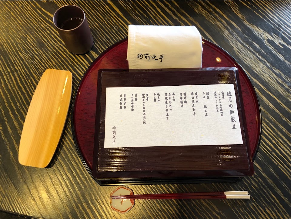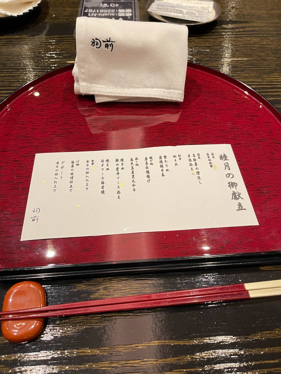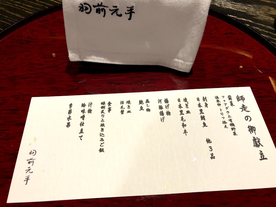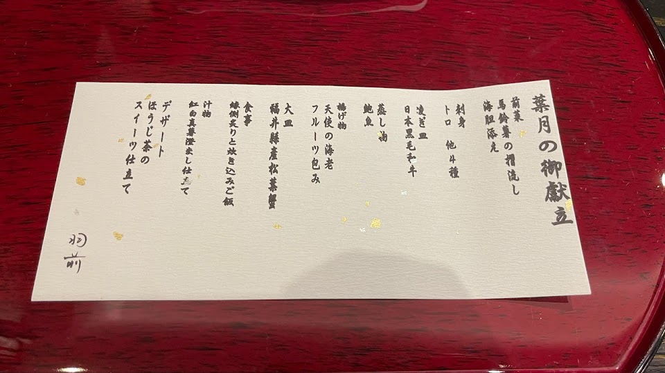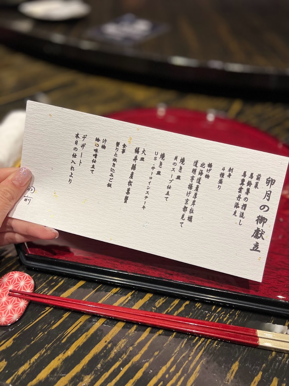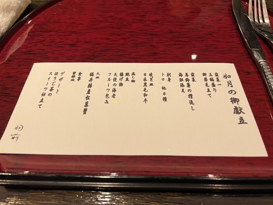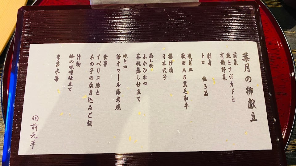 前菜頂級馬糞海膽搭洋芋冷湯、生魚片日本黑鮪魚正肚旬魚4品(我改成伊比利豬肉炸牛蒡)、日本岩手縣活生蠔(我吃烤熟後的蠔)、烤物烤鮑魚、日本A5和牛牛排、天婦羅炸物三品干貝蝦牛肉蘆筍、清蒸松葉蟹(11人搭3隻)、松葉蟹手卷、松葉蟹雜炊粥、日式甜點兩道加咖啡。只是價格不斐,$3500@。