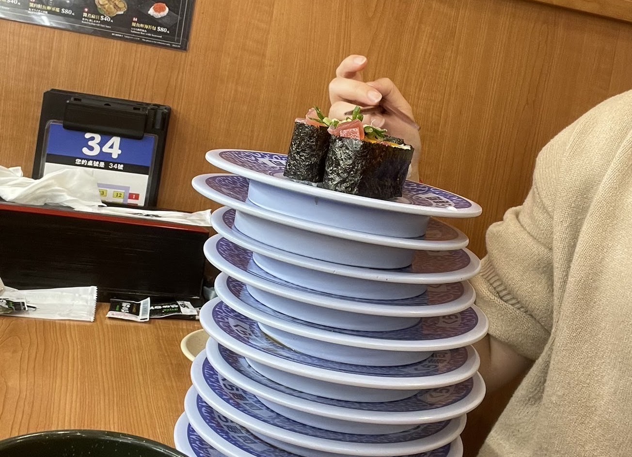 原本吃不到20盤的,破個人紀錄21盤壽司加一碗烏龍麵。至於食物,玉子燒依舊第一,唐揚雞壽司及這次期間限定也不錯。