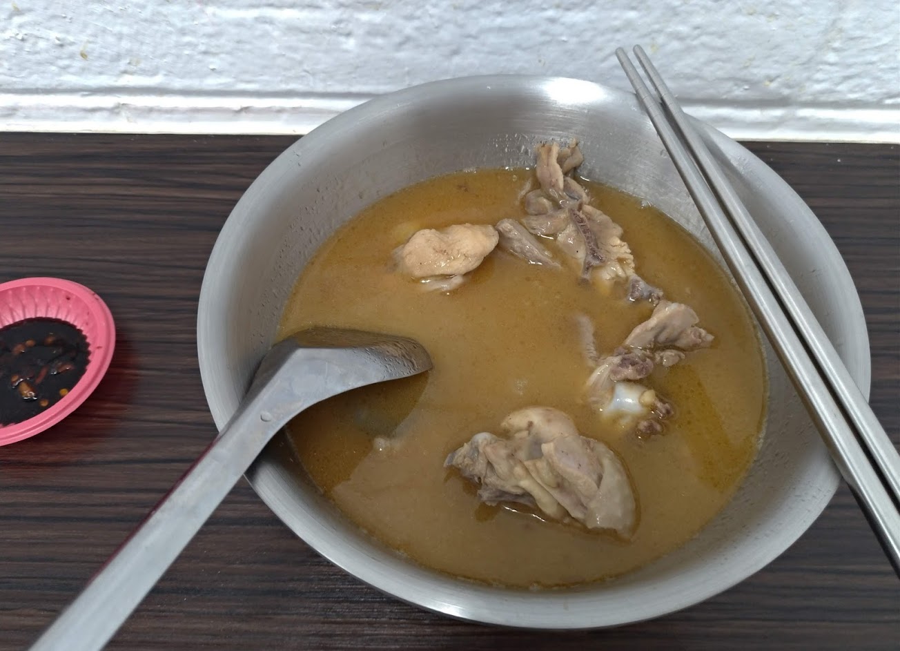 湯頭不是很濃郁,但是也好喝。(重口味的人要考慮一下) 雞肉很嫩!老闆人也很客氣!我來的那天快要打烊,吃完之後老闆說沒錢找我就說不收錢了。 但我還是去旁邊換個錢付給老闆!