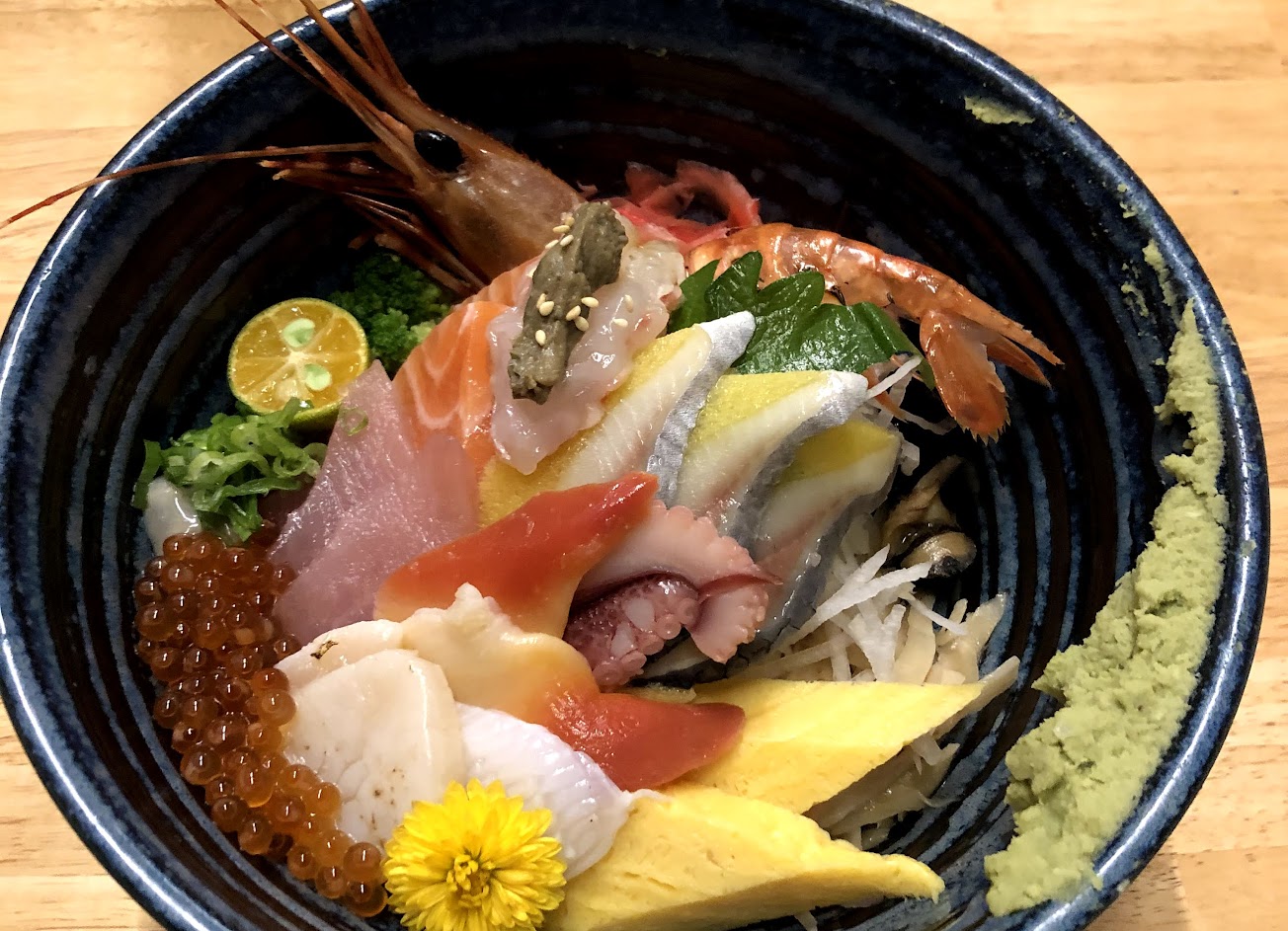招牌盛合海景丼,鮮魚大集合,一次能吃到牡丹蝦、北海道干貝、花枝、鯡魚、鮭魚、鮪魚、旗魚近十種海鮮食材。