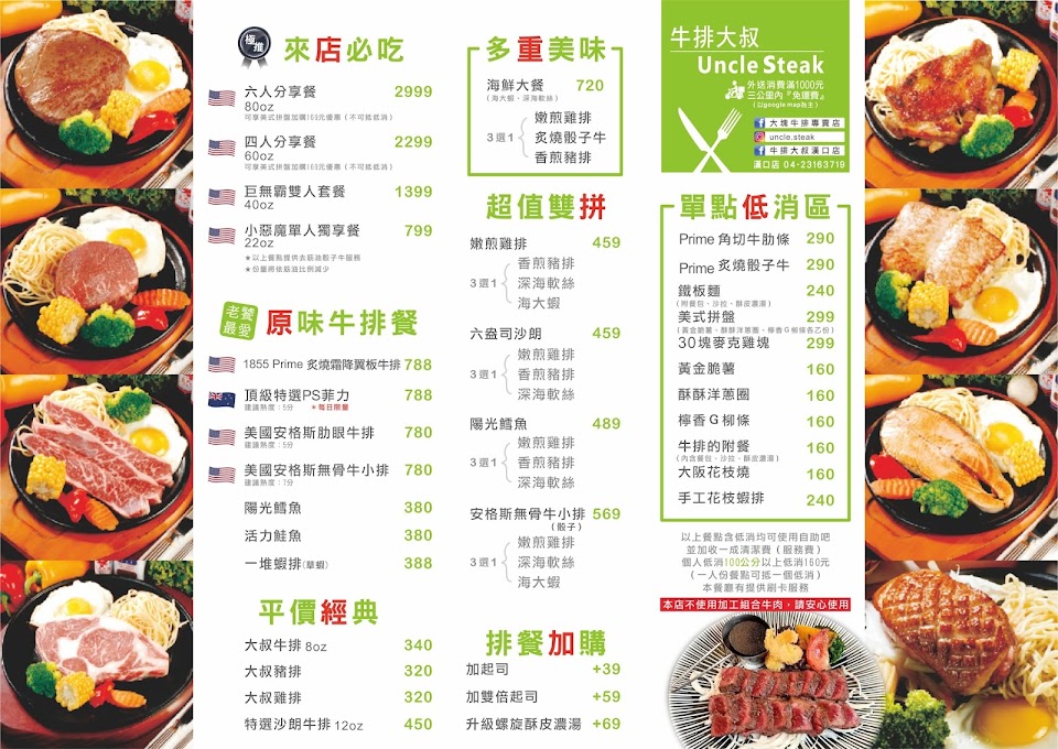 餐點好吃!服務人員很好! 服務 內用 餐點類型 午餐 平均每人消費金額 $600-800 餐點:5 服務:5 氣氛:5 建議的餐點 40盎司牛排, 嫰煎雞排, 酥皮濃湯 沙拉 牛肉湯, 10分熟牛肉乾厚切, 螺旋酥皮濃湯