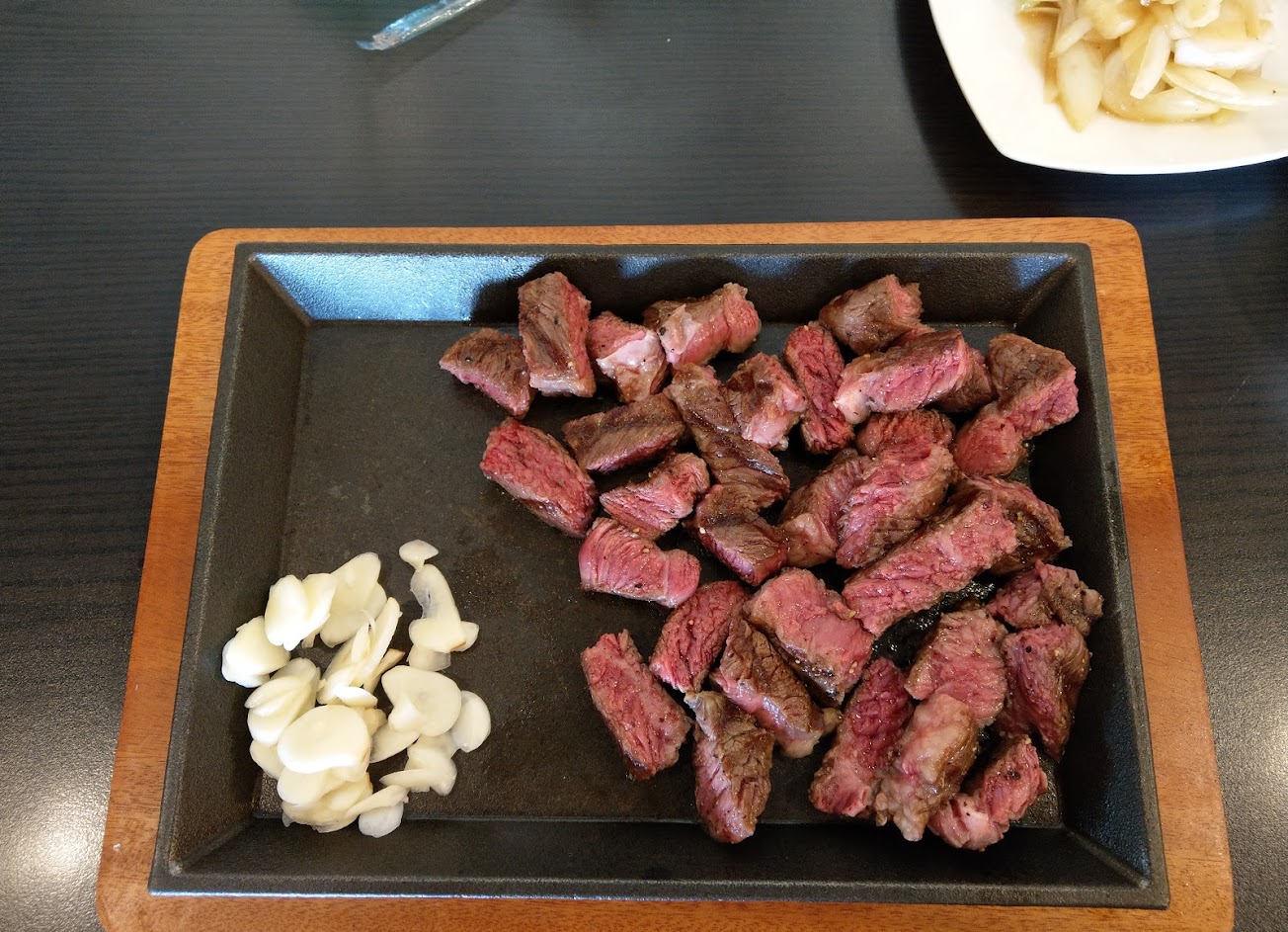 肉質不錯,幾乎沒有看過牛排配醃漬洋蔥,好搭 好好吃~建議老闆環境清潔度可以再加強再乾淨一點,我喜歡貓兒,希望能夠弄好一點的環境,做為友善寵物的店哦