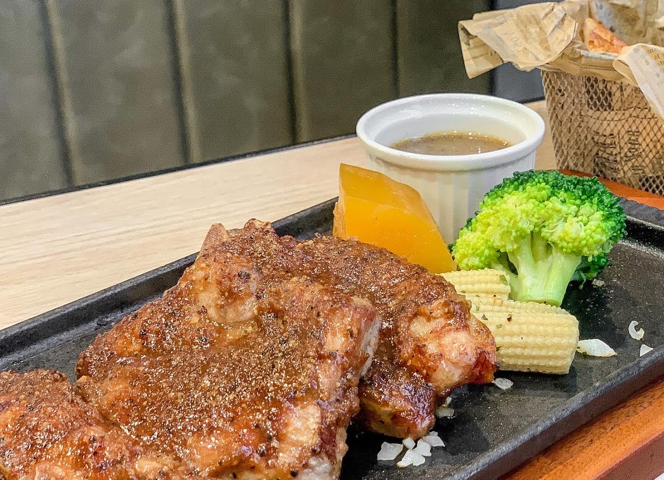 ▲盛在鐵板上,一上桌就冒著熱氣,三大塊豬小排煎得滋滋叫,香氣都被激出來了,還沒吃就覺得肯定好吃,在視覺、聽覺、嗅覺上都是享受