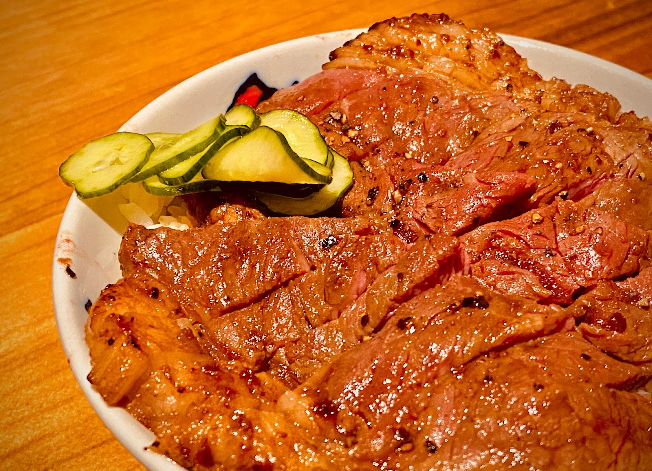 鮮嫩的牛排切塊鋪在飯上滿滿一層