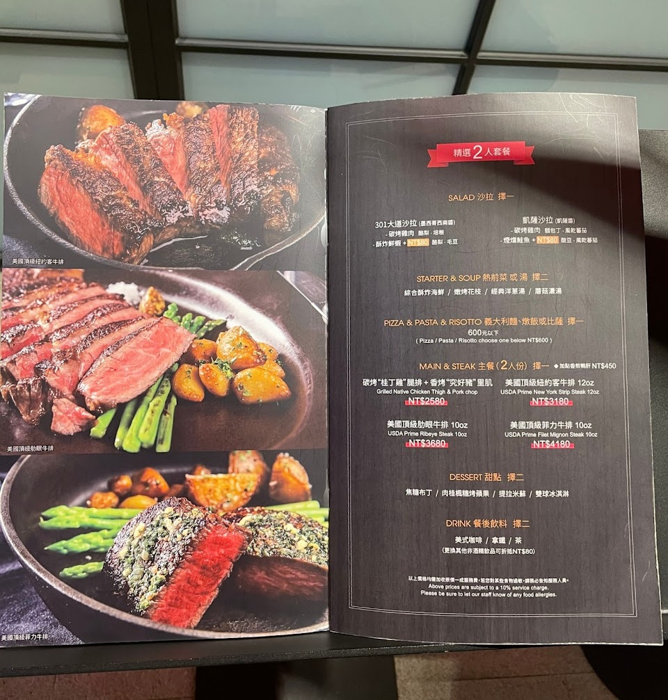 2023.07.31 太太為提前慶祝父親節決定來301吃,女兒點她喜愛的墨魚披薩,我及太太點牛排。整體氣氛不錯,但也許接近父親節,幾乎滿桌,所以服務人員人力相對不太夠,有需要服務時,服務人員都忙著,要等一會才看到我們舉手需要服務。牛排是牛排教父指點,有一定的水準,只不過5 oz 的澳洲和牛在邊緣部份帶著一塊不小的肥肉即使配著瘦肉吃也嫌油膩,倒不如上桌前剔掉也許比較好。點的美式咖啡苦味很多,香味沒有,覺得蠻可惜的。對於喜歡喝咖啡來結束這餐的人,咖啡的隨便就打翻之前各項菜色的努力。希望店家能在咖啡上也下一點努力。