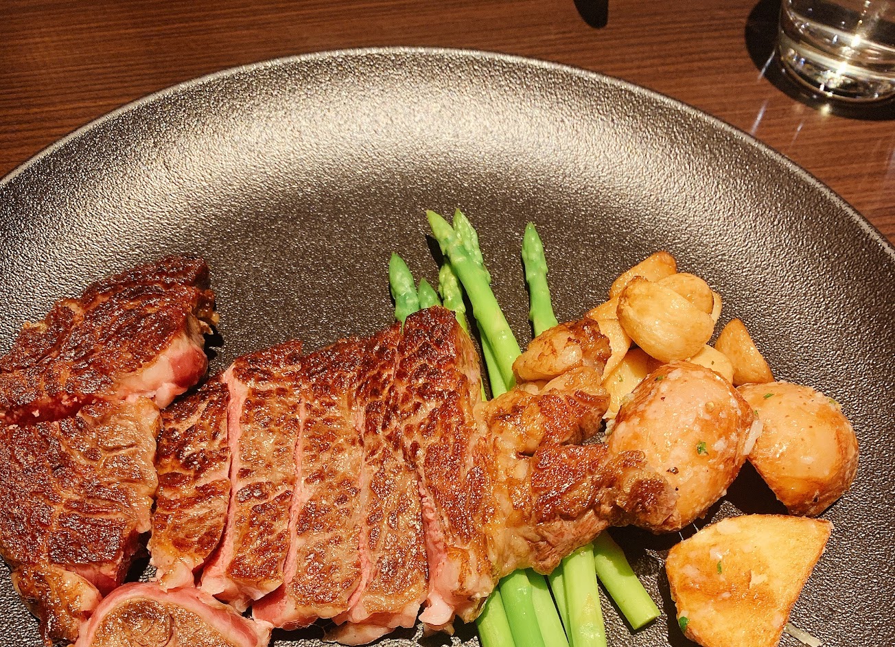 餐廳建議最佳熟度三分熟,果真!非常好吃,特地選用黑色盤子的小巧思,即便是經過熟成後一般人所謂的血水(對我來說是肉汁),在三分熟之下還是會有些許一點點,搭烤馬鈴薯、蘑菇,佐一點海鹽,在這個價格帶內,非常的划算,大推!